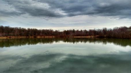 Keywords: lake water clear fresh smooth calm glassy mirror reflection trees forest nature clouds overcast weather outdoor view tranquil peaceful