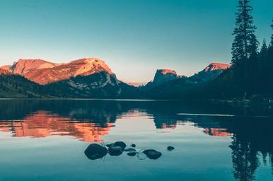 Keywords: lake water landscape nature outdoors reflection mountains trees sunset blue sky rocks