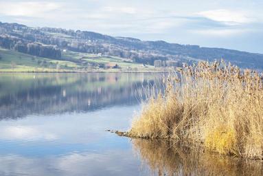 Keywords: lake water reed nature bank autumn sparkle clouds waters tree switzerland baldegg landscape green idyllic wilderness