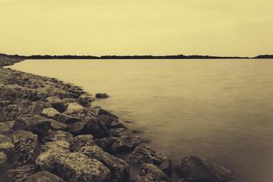 Keywords: lake water rocks dusk yellow