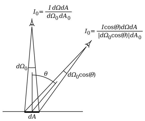 Keywords: Lambert Cosine Law 2.svg en A diagram showing observed intensity from a Lambertian surface; units photons/ s·cm<sup>2</sup>·sr for a normal and off-normal observer; dA<sub>0</sub> is the area of the observing aperture and d is the solid angle subtended by the aperture from the viewpoint of the emitting area element Own Inductiveload 2008-11-27 Lambert's cosine law |