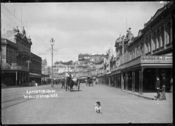 | Keywords: blackandwhite monochrome road outdoor architecture building black and white View looking along Lambton Quay towards the Kelburn Cable Car Lane from the Wairarapa Farmers' corner, with the Occidental Hotel (site of Kirkcaldie and Stains) on the left, the Dresden Piano Company (site of the D.I.C) centre back, and the houses along The Terrace above the Quay in the distance. Photograph taken by William A Price, circa 1910s. Inscriptions: Inscribed - Photographer's title on negative -bottom left: Lambton Quay. Wellington. 633. Quantity: 1 b&w original negative(s). Physical Description: Glass negative Lambton Quay, Wellington. Price, William Archer, 1866-1948 :Collection of post card negatives. Ref: 1/2-001614-G. Alexander Turnbull Library, Wellington, New Zealand. natlib.govt.nz/records/23148418 View looking along Lambton Quay towards the Kelburn Cable Car Lane from the Wairarapa Farmers' corner, with the Occidental Hotel (site of Kirkcaldie and Stains) on the left, the Dresden Piano Company (site of the D.I.C) centre back, and the houses along The Terrace above the Quay in the distance. Photograph taken by William A Price, circa 1910s. Inscriptions: Inscribed - Photographer's title on negative -bottom left: Lambton Quay. Wellington. 633. Quantity: 1 b&w original negative(s). Physical Description: Glass negative Lambton Quay, Wellington. Price, William Archer, 1866-1948 :Collection of post card negatives. Ref: 1/2-001614-G. Alexander Turnbull Library, Wellington, New Zealand. natlib.govt.nz/records/23148418 |