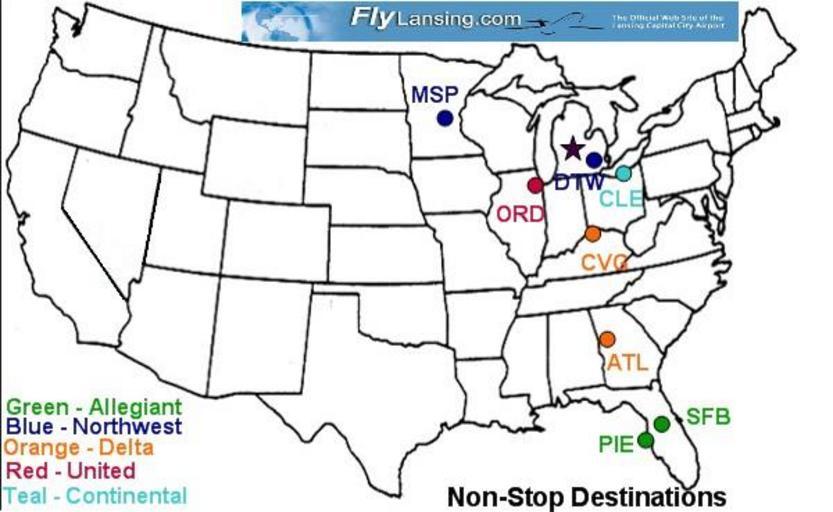 | Keywords: LAN Route Map 2008-May.jpg Updated Capital City Airport Route Map effective May 4th 2008 when Continental Airlines resumes daily service to Lansing from Cleveland en wikipedia dj1997 2007-11-10 RDULAN wikipedia en RDULAN cc-by-sa-3 0 original upload log page en wikipedia CLE_RM jpg 2007-11-10 05 17 Sox23 600×369× 42127 bytes <nowiki>update; Allegiant ends service to LAS</nowiki> 2007-09-23 18 15 RDULAN 600×369× 65031 bytes <nowiki>Updated Capital City Airport Route Map effective May 4th 2008 when Continental Airlines resumes daily service to Lansing from Cleveland </nowiki> Maps of cities served by flights from given airport Capital Region International Airport Transport maps of the United States |
