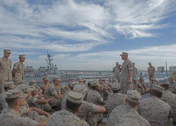 | Keywords: Lance Corporals Leadership and Ethics Seminar 150501-N-CC789-139.jpg en SAN DIEGO May 1 2015 U S Marines assigned to 1st Tank Battalion of the Marine Corps Air Ground Combat Center Twentynine Palms listen a deliver message from Maj Peter Schnurr acting commanding officer 1st Tank Battalion aboard amphibious transport dock ship USS Somerset LPD 25 Somerset served as the platform for a-week long Lance Corporals Leadership and Ethics Seminar to ensure a better understanding of Marine Corps ethos leadership fundamentals and the total Marine amphibious concept The ninth San Antonio-class amphibious transport dock ship Somerset is named in honor of the crew and passengers of United Airlines Flight 93 which crashed near Shanksville Pa in Somerset County during the Sept 11 2001 terrorist attacks U S Navy photo by Mass Communication Specialist 1st Class Vladimir Ramos/Released 2015-05-01 Petty Officer 1st Class VLADIMIR RAMOS https //www dvidshub net/image/1912763 150501-N-CC789-139 2015-05-05 00 01 SAN DIEGO CA US PD-USGov-Military-Navy Marine Corps Air Ground Combat Center Twentynine Palms USS Somerset LPD-25 Images from DoD uploaded by Fæ |