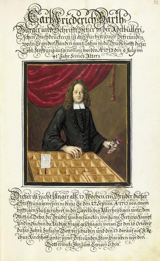 Keywords: Landauer II 022 r.jpg Transkription und weitere Informationen siehe http //www nuernberger-hausbuecher de/75-Amb-2-279b-22-r/data Carl Friederich Karl Friedrich Barth Bart Schrifft Setzer Setzer Hausbuch der Landauerschen Zwölfbrüderstiftung Band 2 Nürnberg 1708 “1806 Stadtbibliothek Nürnberg 279b 2° via http //www nuernberger-hausbuecher de/ 1713 anonymous PD-old-100 Hausbuch der Landauerschen Zwölfbrüderstiftung Band 2 Printers in art Type cases |