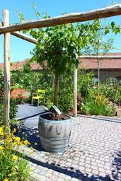 Keywords: landesgartenschau landau wood tree architecture building blue sky no cloud summer market sector flowers wine barrel away
