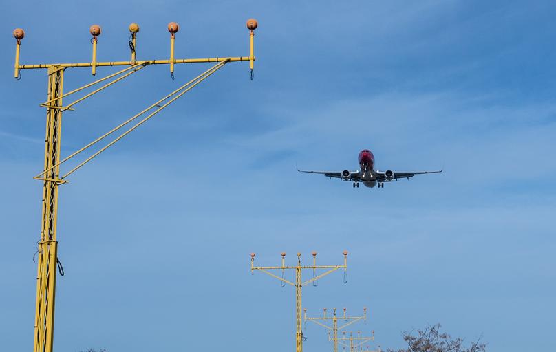 Keywords: landing land aircraft sky clouds blue fly wing aviation