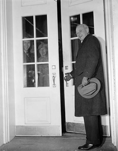 | Keywords: LandonAtWH.jpg Alf Landon Governor of Kansas visiting the White House after his defeat in the 1936 presidential election against Franklin D Roosevelt http //hdl loc gov/loc pnp/hec 21876 Library of Congress Harris Ewing 1936-12 PD-Harris-Ewing hec 21876 Cropped and some other things Alf Landon White_House in 1936 Doors in Washington D C |