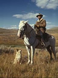 Keywords: landscape 1942 sky clouds rancher man horse dog nature outside plains grass brush country countryside