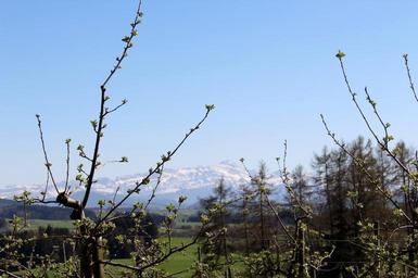 Keywords: landscape apple trees flowers spring mountains alpstein sky