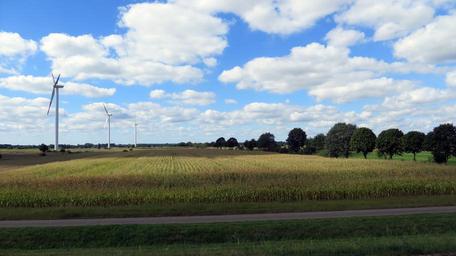 Keywords: landscape cycle paths cyclists idyllic bike horse bicycle tour reported fields wind turbines clouds sky