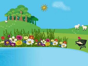 Keywords: landscape field nature trees green prairie summer sheep flowers bench bird hat grove pond blue green