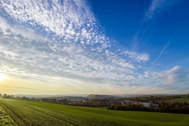 Keywords: landscape field place city village sky clouds nature fields germany vision wide angle blue sun green homes hargesheim afternoon sun sunset
