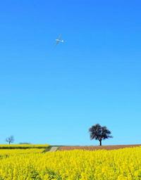 Keywords: landscape field of rapeseeds nature field spring tree glider pilot summer rape blossom yellow copy space