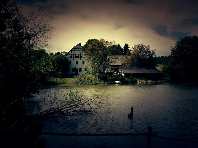 Keywords: landscape home lake building nature pond water evening light fairy tales