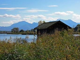 Keywords: landscape hut lake mountains sky blue clouds reed chiemsee upper bavaria autumn quiet
