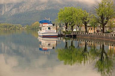 Keywords: landscape lake boot nature water bank trees clouds ship natural lakeside mountains mirroring blue panorama wave clear mondsee spring leaves seawall charming beautiful idyllic