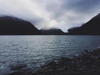 Keywords: landscape lake water rocks mountains snow peaks clouds cloudy