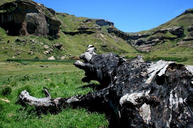 Keywords: landscape mountain green grass rocks tree stump twisted and blackened blue sky
