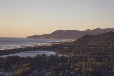 Keywords: landscape mountains beach sand shore water ocean sea trees forest houses town