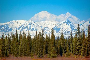 Keywords: landscape mountains snow peaks blue sky trees nature outdoors