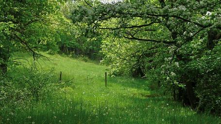 Keywords: landscape nature field spring trees grass green prairie promenade shades palette