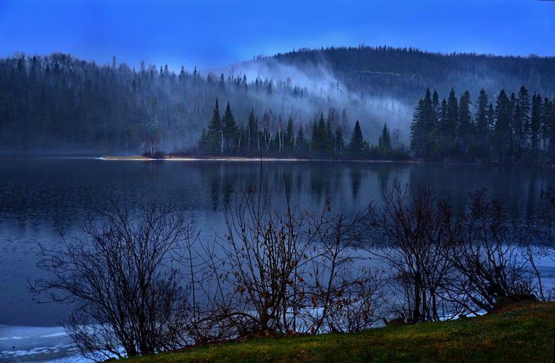 Keywords: landscape nature mountain trees mist wood lake rain canada québec