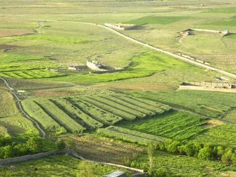 Keywords: landscape nature outside fields trees plants crops agriculture farm road colorful green summer spring buildings vista country countryside