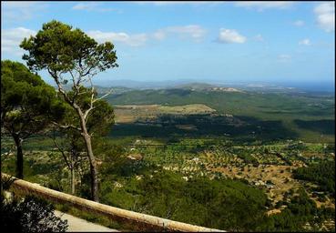 Keywords: landscape nature summer sky clouds rest vision foresight holiday travel view blue lookout tree trees cloud pine plant south green flat fields mallorca island spain