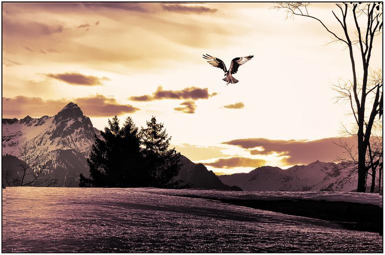 MAKE A MEME View Large Image landscape nature sunrise lighting bird raptor mountains mountain peaks sky clouds sunlight outlook rest morgenstimmung silent relaxation painting digital painting greeting card
