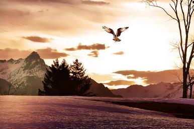 Keywords: landscape nature sunrise lighting bird raptor mountains mountain peaks sky clouds sunlight outlook rest morgenstimmung silent relaxation painting digital painting greeting card