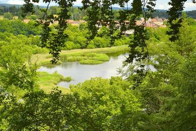 Keywords: landscape pond lake tree water reed clouds bank blue