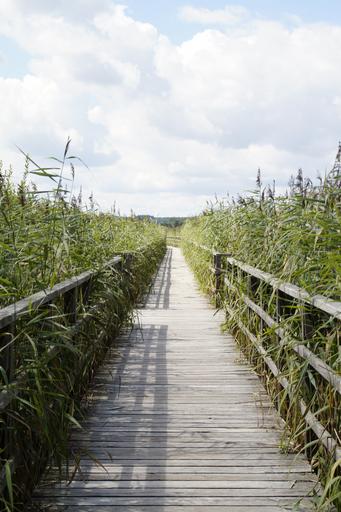 Keywords: landscape spring lake nature reserve nature moorland wetland summer grasses reed silted nature conservation southern germany sky clouds summer landscape baden württemberg far web bridge boardwalk wooden planks wooden boards away
