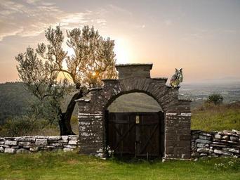 Keywords: landscape sunset tree gate fence stone wall green grass owl outdoors nature sky sunlight horizon light meadow environment view scenic country