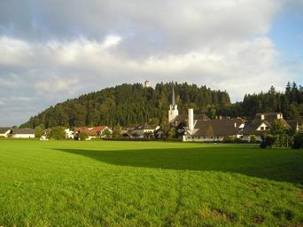 Keywords: landscape village town buildings houses church architecture summer forest trees woods plants nature outside