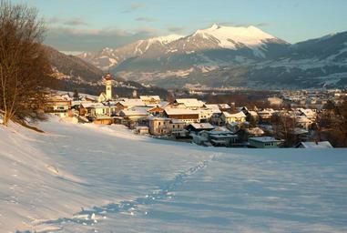 Keywords: landscape village town houses homes buildings architecture winter snow ice mountains forest trees woods valley nature outside