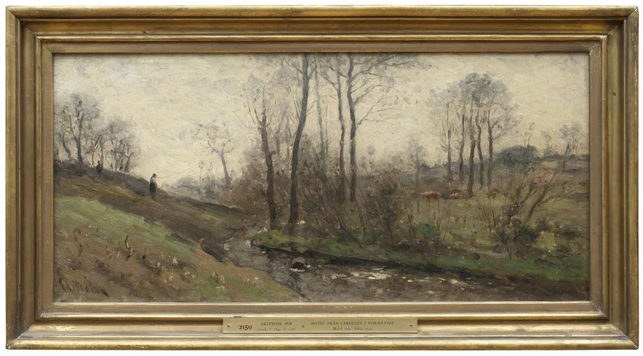 | Keywords: Landscape with a Running Brook. Scene from the Carolles in Normandy (Per Ekström) - Nationalmuseum - 19219.tif Artwork Creator Per Ekström Landscape with a Running Brook Scene from the Carolles in Normandy Per Ekström went to France in 1876 and stayed there until 1890 In 1882 “1887 he was living in the village of Carolles on the Nomandy coast where he found the scene for this painting From the 1880s his plein air painting focused on the study of the atmospheric effects of light as in this portrayal of a water meadow on a sunny misty spring day One of his primary influences was the French landscape painter Camille Corot Ekström periodically Per Ekström reste till 1876 till Frankrike där han stannade till 1890 Ã…ren 1882 “1887 vistades han i byn Carolles vid Normandies kust där han hämtade motivet till den här mÃ¥lningen FrÃ¥n 1880-talet var hans friluftsmÃ¥leri inriktat pÃ¥ studiet av ljuseffekter i luften som här i skildringen av en vattensjuk sänka en solig men disig vÃ¥rdag En av hans främsta förebilder var den franske landskapsmÃ¥laren Camille Corot Ekström var i Carolles periodvis utan kontakt med sina svenska konstnärskamrater och levde under svÃ¥ra ekonomiska omständigheter header Per Ekström went to France in 1876 and stayed there until 1890 In 1882 “1887 he was living in the village of Carolles on the Nomandy coast where he found the scene for this painting From the 1880s his plein air painting focused on the study of the atmospheric effects of light as in this portrayal of a water meadow on a sunny misty spring day One of his primary influences was the French landscape painter Camille Corot Ekström periodically Per Ekström reste till 1876 till Frankrike där han stannade till 1890 Ã…ren 1882 “1887 vistades han i byn Carolles vid Normandies kust där han hämtade motivet till den här mÃ¥lningen FrÃ¥n 1880-talet var hans friluftsmÃ¥leri inriktat pÃ¥ studiet av ljuseffekter i luften som här i skildringen av en vattensjuk sänka en solig men disig vÃ¥rdag En av hans främsta förebilder var den franske landskapsmÃ¥laren Camille Corot Ekström var i Carolles periodvis utan kontakt med sina svenska konstnärskamrater och levde under svÃ¥ra ekonomiska omständigheter decade 1880 Oil on canvas Olja pÃ¥ duk Size cm 65 30 5 Framed Size cm 74 40 6 Institution Nationalmuseum Stockholm Signerad Ekström accession number 19219 NM 2159 place of creation Hans Thorwid / Nationalmuseum Nationalmuseum Stockholm cooperation project Licensed-PD-Art PD-old-auto PD-Nationalmuseum_Stockholm 1935 Media contributed by Nationalmuseum Stockholm 2016-10 Paintings in the Nationalmuseum Stockholm Per Ekström |