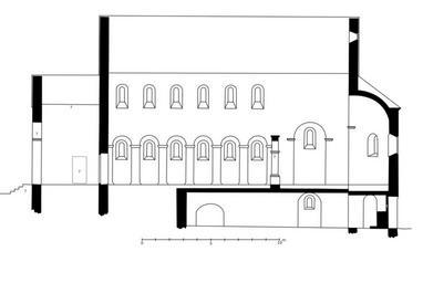 | Keywords: Längsschnitt von Süden Rekonstruktion Müller.svg en drawing of the Einhardsbasilika Steinbach Germany de Zeichnung der de Einhardsbasilika Steinbach <br/> Aus de Bild Längsschnitt von Süden Rekonstruktion Müller jpg Der Längsschnitt geht mit Blick nach Norden Die eingezeichnete Treppe zum Atrium ganz links ist ungesichert daher das Fragezeichen Zu erkennen ist danach von links das Atrium welches 1182 niedergelegt wurde an seine Stelle trat das romanische Westportal zwischen den Türmen Die heutige westliche Mauer erhebt sich dort wo in der Rekonstruktionszeichnung die westliche Mauer des Atriums steht Die ursprüngliche Westseite des Hauptschiffs so wie hier gezeichnet existiert nicht mehr Zu erkennen sind die karolingischen Rundbogenfenster oberhalb des Obergadens Sie existieren bis heute im Originalzustand Weiterhin zu sehen sind die Arkaden des nördlichen Seitenschiffs heute vermauert Im heutigen Zugang des vermauerten nördlichen Nebenchores befindet sich eine spitzbogige gotische Türe Zu erkennen ist außerdem in der Krypta die nördliche Arkonsolnische und rechts unterhalb der Haupapsis der Platz des vermuteten Hauptaltars in der Krypta Die Platte und der Sockel des Altars sind noch vorhanden und befinden sich ebendort Own work based on de Bild Längsschnitt_von_Süden_Rekonstruktion_Müller jpg by de Benutzer Capaci34 based on the dissertation of Dr Otto Müller 1937 MaEr 26 August 2008 MaEr 2008-03-26 Capaci34 49 41 15 N 08 59 48 E Plans of Einhardsbasilika Steinbach Reconstruction drawings of medieval buildings in Germany |