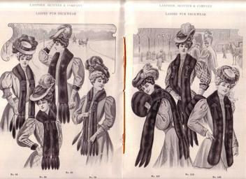 Keywords: Lanpher Furs Neckware.jpg Fur Retail Trade Lanpher Furs; Ladies' Fur Neckware 95 Natural Mink with 6 tails 47 50 ; 89 Black Dyed Marten Skunk with 6 tails and girdle 9 - ; 83 Isabella American Opossum with 6 tails and head 6 50 ; 78 Sable Dipped Muskrat with 6 tails and girdle 5 - ; 107 Sable Russian Lynx 76 inches long with head and 6 tails 5 50 ; 119 Isabella American Opossum 80 inches long with 4 tails 12 50 ; 106 Sable Russian Lynx 76 inches long with head and 6 tails 5 50 Pelz-Kolliers 'Lanpher Furs North Star Brand Lanpher Skinner Co St Paul Minn Season 1906-7 72 pages page 36-37 1906/2008 unknown/--Kuerschner 20 07 2 February 2008 UTC PD-old Fur garments in art Muffs in art Mink clothing in art Marten clothing in art Skunk clothing in art Opossum clothing in art Musquash clothing in art Lynx clothing in art Female headgear in art Lanpher Furs North Star Brand Season 1906-7 Lanpher Skinner Co Saint Paul Minnesota 36-37