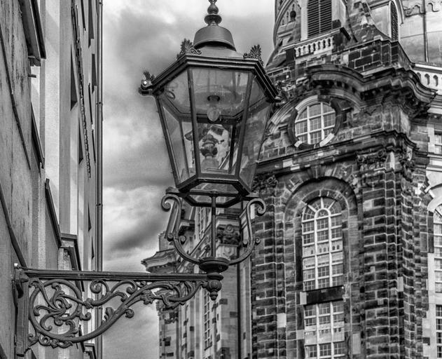 Keywords: lantern lighting street lamp schmie­de­ei­sern frauenkirche dresden blacksmithing metal historic street lighting nostalgia black white
