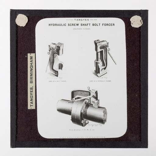 Keywords: Lantern Slide - Tangyes Ltd, Screw-Shaft Bolt Forcer, circa 1910.jpg Three views of a Tangye hydraulic screw-shaft bolt forcer Size mm 83 83 3 exhibition history Text printed in black ink on white adhesive paper label over black mask TANGYES BIRMINGHAM Institution Museum Victoria Lantern Slide Black White object history One of 239 glass lantern slides depicting products manufactured by Tangyes Limited engineers of Birmingham England The images include various products such as engines centrifugal pumps hydraulic pumps gas producers materials testing machines presses machine tools hydraulic jacks etc Tangyes was a company which operated from 1857 to 1957 They produced a wide variety of engineering products exported worldwide including Australia and other British colonies It is thought that this collection of magic lantern slides was used by a local agent for sales purposes These images were originally used to illustrate Tangyes Ltd product catalogues from the period 1910 - circa 1920s PD-Australia author http //collections museumvictoria com au/items/803608 Info http //collections museumvictoria com au/content/media/16/433916-original jpg Image Uploaded with GWToolset Lantern Slide - Tangyes Ltd Screw-Shaft Bolt Forcer circa 1910 http //collections museumvictoria com au/content/media/16/433916-original jpg Tangyes Lantern Slide Collection |
