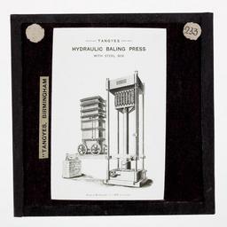 | Keywords: Lantern Slide - Tangyes Ltd, Baling Press, circa 1910.jpg Tangye's hydraulic baling press with steel box on rails Size mm 83 83 3 exhibition history Text printed in black ink on white adhesive paper label over black mask TANGYES BIRMINGHAM Institution Museum Victoria Lantern Slide Black White object history One of 239 glass lantern slides depicting products manufactured by Tangyes Limited engineers of Birmingham England The images include various products such as engines centrifugal pumps hydraulic pumps gas producers materials testing machines presses machine tools hydraulic jacks etc Tangyes was a company which operated from 1857 to 1957 They produced a wide variety of engineering products exported worldwide including Australia and other British colonies It is thought that this collection of magic lantern slides was used by a local agent for sales purposes These images were originally used to illustrate Tangyes Ltd product catalogues from the period 1910 - circa 1920s PD-Australia author http //collections museumvictoria com au/items/803551 Info http //collections museumvictoria com au/content/media/40/434990-original jpg Image Uploaded with GWToolset Lantern Slide - Tangyes Ltd Baling Press circa 1910 http //collections museumvictoria com au/content/media/40/434990-original jpg Tangyes Lantern Slide Collection Hydraulic presses |