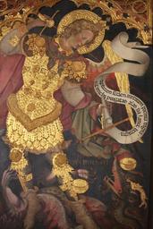 | Keywords: L'arcangelo Gabriele di Jacobello del Fiore (Trittico della Giustizia), (1).JPG Art photo Q27077942 Creator Jacobello Del Fiore title Justice between the Archangels Michael and Gabriel La Giustizia in trono tra gli arcangeli Michele e Gabriele <br> alternate title title Triptych of Justice Trittico della Giustizia en Justice seated between two lions and the archangels Michael and Gabriel She holds her attributes sword and scales it simbolo della Divina Sapienza tra due leoni che rimandono al trono di Salomone La Giustizia regge con la destrala spada e porta con la sinistra la bilancia San Michele sorregge la bilancia e trasfigghe il drago L'angelo guerriero e difensore della chiesa - nella sua duplice funzione di pesatore di anime e di combattente contra il drago simbolo di Satana 1421 Tempera on panel size cm 208 490 LangSwitch Mittelteil central panel centre/panneau central middenpaneel cm 208 194 ; Saint Michel cm 208 133 ; Saint Gabriel cm 208 163 Institution Gallerie dell'Accademia Venice 01 01 http //www gallerieaccademia it/sale/sala-i Gallerie dell'Accademia<br>Richard Hunter S P Oakley Latin Literature and its Transmission https //books google de/books id A6fZCgAAQBAJ pg PA178 lpg PA178 dq Jacobello+del+fiore+Justice+between+the+Archangels+Michael+and+Gabriel source bl ots WGbh7hEoFM sig tvNmvN_O702pDIBvEUkwy3SFFAM hl de sa X ved 0ahUKEwiczeqc2azOAhVIthQKHd6QBf0Q6AEIZjAN v onepage q Jacobello 20del 20fiore 20Justice 20between 20the 20Archangels 20Michael 20and 20Gabriel f false books google object history it eseguito per la sede del Magistrato del Proprio in Palazzo Ducale credit line en above the head of the left lion Artist's name and date Fiore pinxit 1421 1000 years after the legendary founding of Venice <br> it Le parole dietro la Giustizia Eseguirò gli ammonimenti degli angeli e le parole sacre blanda con i pii nemica dei malvagu e superba con gli orgogliosi sono generalmente attribuite a CristoGiudice nell'arte nordica É evidente l'identificazione della Giustizia con Venezia rappresentata anche nel rilievo sula faciata ouest di Palazzo Ducale L'importante commissione mostra 'influenza di Gentile da Fabriano La cornice presenta sull'estrema destra lo stemma di Tommaso Mocenigo doge 1414-1423 Gabriel Virginei partus humanae nuncia pacis<br>Vox mea virgo ducem rebus te poscit opacis<br> my voice which announces the virgin's birth demands you virgin as leader for your gloomy affairs <br> en The inscriptions are political and religious as the 25th of March is the date of Annunciation and of the legendary founding of Venice accession number cat 15 artwork license PD-old-100-1923 own Mongolo1984 photo license cc-by-sa-3 0 it DEFAULTSORT Jacobello Del Fiore Justice between the Archangels Michael and Gabriel Jacobello Del Fiore - Justice between the Archangels Michael and Gabriel - Accademia Venice D02 Paintings of Saint Michael in Italy 15th-century paintings of Saint Michael Paintings of men with swords Paintings with Latin inscriptions Scales in art Paintings Jacobello Del Fiore Justice between the Archangels Michael and Gabriel Images from Wiki Loves Monuments 2014 Images from Wiki Loves Monuments 2014 in Italy needing check Images from Wiki Loves Monuments 2014 in Italy Uploaded via Campaign wlm-it |