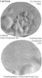 | Keywords: Larissa map.gif Shaded relief map of Larissa a small inner satellite of Neptune As with all maps it is the cartographer's interpretation and not all features are necessarily certain given the limited data available - this interpretation stretches the data as far as is feasible The original map was published in its full form with latitude-longitude grid and feature names in Stooke P J 1994 The Surfaces of Larissa and Proteus EARTH MOON AND PLANETS V 65 pp 31-54 Positions in the map are controlled by a digital shape model described in that paper The shape data for Larissa are very limited For this map the three dimensional convex hull of the shape model was projected into the Morphographic Conformal Projection the conventional Stereographic Projection modified for non-spherical worlds The leading side longitude 90 runs vertically down the centre faces forwards in the orbit of Larissa The trailing side longitude 270 runs vertically down its centre faces backwards along the orbit Longitude 0 is at the righthand end of the leading side and faces Neptune As with all conformal true shape projections the scale in these maps varies increasing from the centre to the outer edge The map projection is described in Stooke P J and Keller C P 1990 Map Projections for Non-Spherical Worlds / the Variable-Radius Map Projections CARTOGRAPHICA V 27 No 2 pp 82-100 en wikipedia 1994 Philip Stooke http //publish uwo ca/~pjstooke/larissa txt Public Domain Philip Stooke Larissa moon |