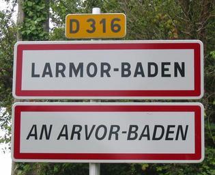| Keywords: Larmor-Baden bilingual sign.jpg Bilingual city limits sign at Larmor-Baden Brittany France Own 2007-08-23 Man vyi Larmor-Baden Bilingual Breton-French road signs Multilingual place name signs in France City limit signs in Morbihan 316 number Location not applicable |