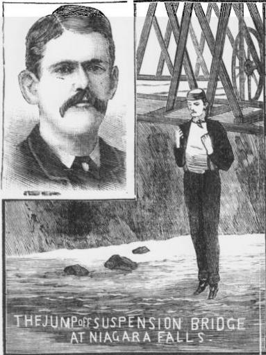 Keywords: Larry Donovan Jump off Suspension Bridge at Niagara Falls.png Larry Donovan jumping from the suspension bridge at Niagara Falls Inset close up of his face 1887-06-18 Cropped images from the cover of the Police News Law Courts and Weekly Record 1887-06-18 UK Accessed via Gale Newsvault author other versions PD-old-70-1923 Larry Donovan bridge jumper |