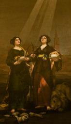 | Keywords: Las santas Justa y Rufina.jpg El cabildo catedralicio sevillano le encargó este cuadro a Goya en 1817 y por mediación de Agustín Ceán Bermúdez que era un erudito y escritor de arte y amigo personal de Goya El cuadro estaba destinado al altar de la Sacristía de los Cálices de la catedral de Sevilla España donde aún permanece Y conviene señalar que las santas alfareras Justa y Rufina que son las patronas de Sevilla fueron martirizadas por haberse negado a adorar una imagen de la diosa Venus y siempre suelen ser representadas junto a objetos de barro como símbolo de su profesión y con las palmas del martirio En esta obra un león lame mansamente el pie de Santa Rufina herido por haberla forzado a caminar desde la sierra hasta Sevilla y esta ciudad aparece al fondo destacándose la Torre de la Giralda de la catedral sevillana que según la tradición quedó en pie por la intervención milagrosa de estas mártires durante el terremoto que asoló Sevilla en 1504 1817 oil canvas Size cm 177 309 Catedral de Santa María de la Sede de Sevilla Sacristía de los Cálices de la catedral de Sevilla https //www museodelprado es/coleccion/galeria-on-line/galeria-on-line/obra/santa-justa-y-santa-rufina/ object history exhibition history credit line accession number File Santa Justa y Rufina jpg cropped and retouched PD-old-100 cropped and retouched levels Vecellio Santa Justa y Rufina jpg Santas Justa y Rufina Francisco de Goya |