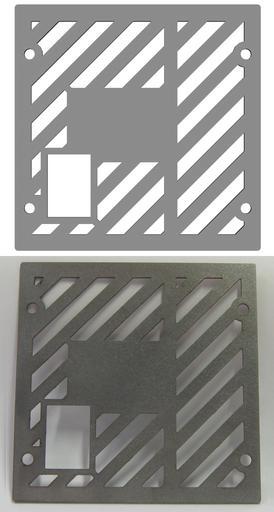 | Keywords: Laser cutting CAD and physical part.png  This picture shows top a CAD model of a metal part and bottom the manufactured part produced by laser cutting from 0 5mm thick stainless steel Ober CAD-Modell unt Unterhalb Laserschneiden stahl User Mike1024 2008-12-07 User Mike1024 Laser cutting Taken with Canon PowerShot A80 |