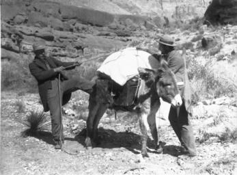 | Keywords: "The last pull on the diamond hitch" -- two men packing a burro, ca.1898 (CHS-4698).jpg en <br> The last pull on the diamond hitch -- two men packing a burro ca 1898 Photograph of The last pull on the diamond hitch -- two men packing a burro ca 1898 One man using his leftt foot and leg for leverage against the burro tugs on a rope holding the pack to the burro The other man adjusts the rope on the pack They both wear jackets over their shirts with trousers and hats The desert landscape rocky and arid A rocky slope is visible in the background Call number CHS-4698 Photographer James George Wharton Filename CHS-4698 Coverage date 1897/1899 Part of collection California Historical Society Collection 1860-1960 Format glass plate negatives Type images Part of subcollection Title Insurance and Trust and C C Pierce Photography Collection 1860-1960 Repository name USC Libraries Special Collections Accession number 4698 Microfiche number 1-76-22 Archival file chs_Volume36/CHS-4698 tiff Repository address Doheny Memorial Library Los Angeles CA 90089-0189 Geographic subject country USA Format aacr2 3 photographs glass photonegative photoprints b w ; 17 x 22 cm Rights Digitally reproduced by the USC Digital Library; From the California Historical Society Collection at the University of Southern California Subject adlf transportation features Project USC Repository email specol usc edu Identifying number unidentified no James-658 Contributing entity California Historical Society Date created 1897/1899 Publisher of the digital version University of Southern California Libraries Format aat photographic prints; photographs Geographic subject state California Legacy record ID chs-m2760; USC-1-1-1-2827; USC-1-1-1-9779 Access conditions Send requests to address or e-mail given Phone 213 821-2366; fax 213 740-2343 Subject file heading Industry -- Mining -- Miners; Animals -- Burros Subject lcsh Mines and mineral resources; Miners; Donkeys 1897/1899 date created George Wharton James 1858 1923 http //digitallibrary usc edu/cdm/ref/collection/p15799coll65/id/3659 PD-old-70-1923 Donkeys of the United States Miners from the United States 1898 in the United States Images from USC Digital Library uploaded by Fæ Photographs by George Wharton James California Historical Society Collection 1860-1960 Glass plate negatives |