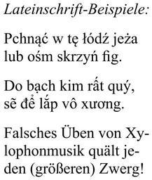 | Keywords: Latin script samples (Pangrams from Polish, Vietnamese, and German) 2.svg en Latin script samples Pangrams from Polish Vietnamese and German title in German Text of the Polish and German samples taken from Wikipedia w de Pangram Vietnamese text from https //aseaanarion wordpress com/2010/12/17/dogs-are-not-that-lazy/ here The font used is Times New Roman 2015-10-18 own Karl432 other versions Otherversion File Latin script samples Pangrams from Polish Vietnamese and German 1 svg English headline cc-zero Additionally the following applies PD-text Latin alphabet typography Times New Roman Uploaded with UploadWizard |